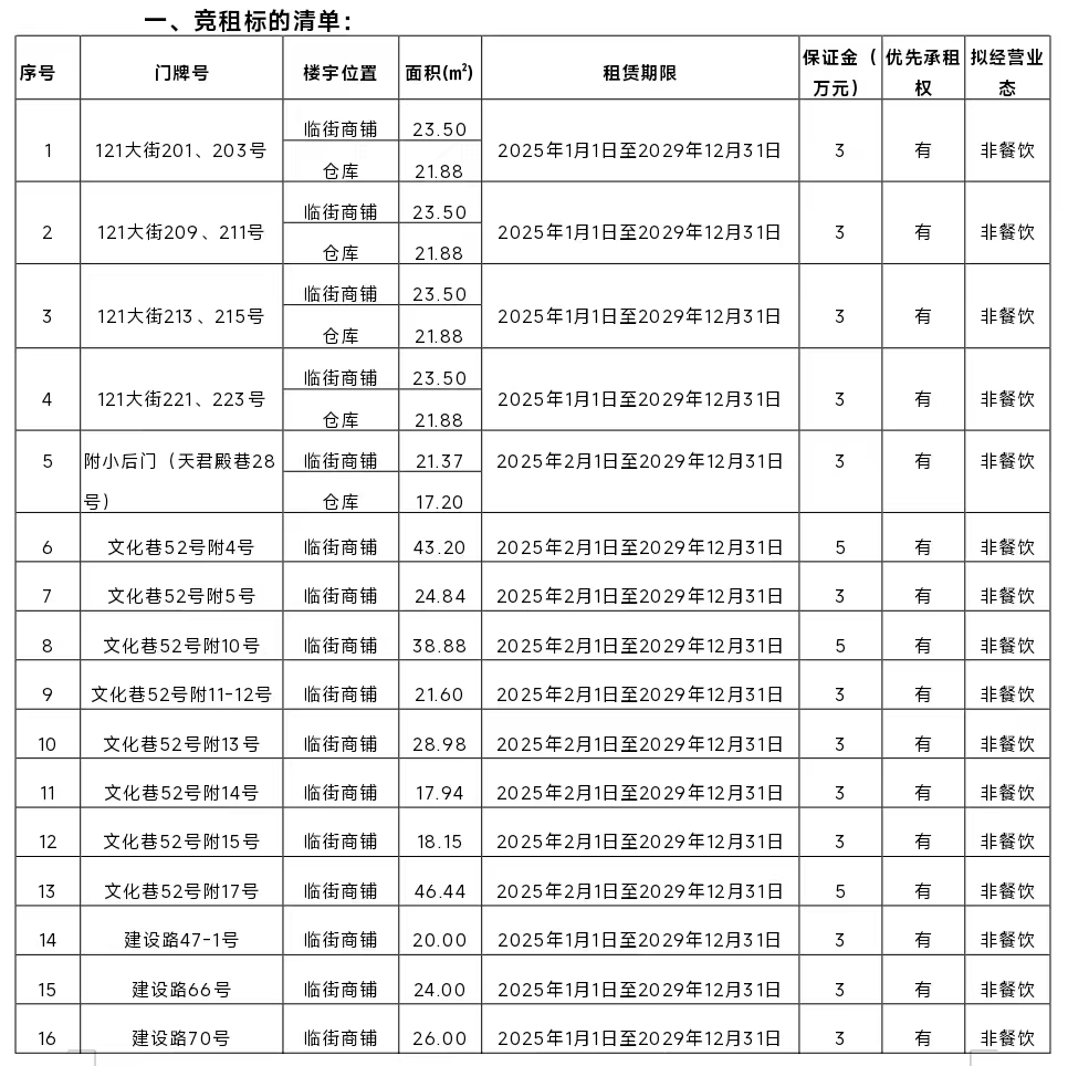 1.本次竞价招租,有优先权的原商铺承租人同等条件下优先;