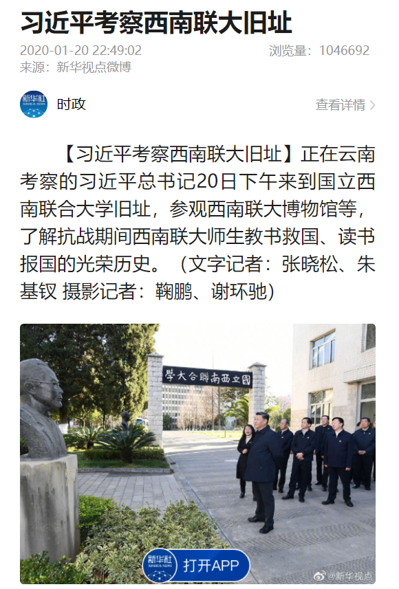 上一条:CCTV-1综合频道 2020-01-21 习近平春节前夕赴云南看望慰问各族干部群众 向全国各族人民致以美好的新春祝福 祝各族人民生活越来越好祝祖国欣欣向荣 下一条:教育部新闻办 微言教育 2020-01-20 习近平考察西南联大旧址:教育要同国家之命运、民族之前途紧密联系起来