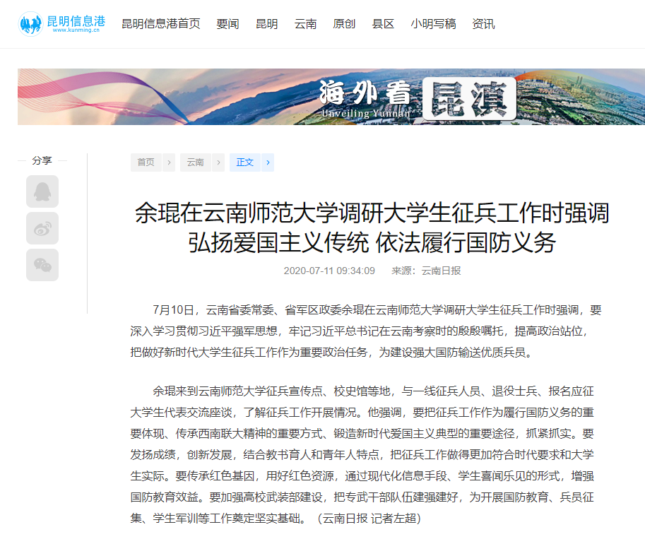 上一条:云南日报 2020-07-11 弘扬爱国主义传统 依法履行国防义务 下一条:云南新闻联播 2020-07-11 余琨在德赢官网Vwin调研大学生征兵工作时强调 弘扬爱国主义传统 依法履行国防义务