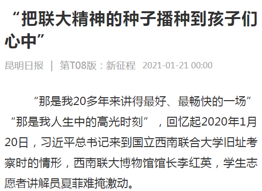 上一条:云南信息报 2021-01-21 【奋斗百年路 启航新征程】西南联大:传不辍弦歌,育今日芬芳 下一条:云南发布 2021-01-20 《光明日报》头版报道:云南师大全体师生牢记习近平总书记的殷殷重托 传不辍弦歌 育今日芬芳
