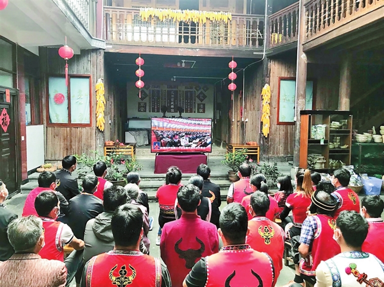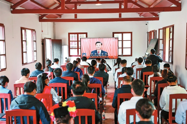 10月16日上午,持续半月阴雨的独龙江峡谷晴空万里,艳阳高照。怒江傈僳族自治州贡山独龙族怒族自治县独龙江乡200余名干部群众,聚在独龙族博物馆收看党的二十大开幕会。