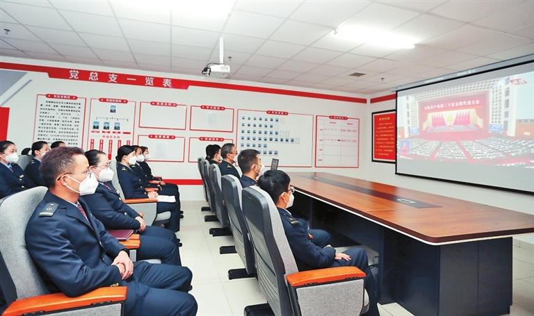 10月16日,昆明南站站前广场彩旗飘扬,鲜花绽放,一派喜庆祥和。上午10时,车站的干部职工聚在党员活动室,聆听习近平同志代表第十九届中央委员会向党的二十大所作报告。