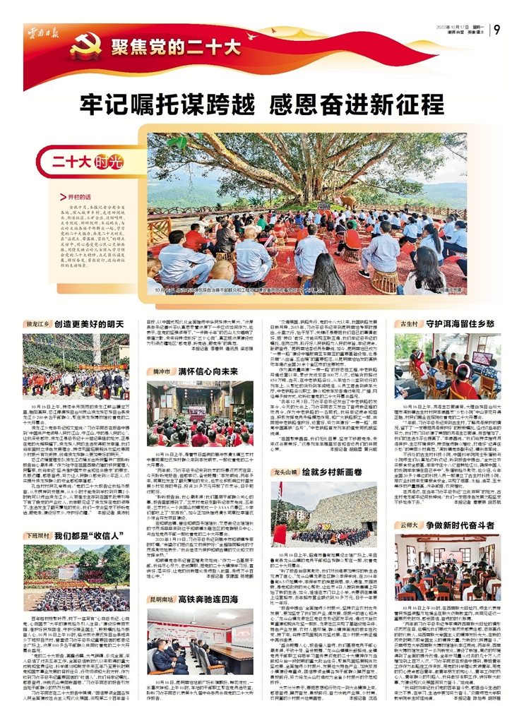 金秋十月,本报记者分赴全省各地,深入城市乡村,走进田间地头、街道社区、工矿企业、边防哨所、大专院校、科研院所、车站码头,与云岭大地各族干部群众一起,学习党的二十大报告,共度二十大时光。在“沾泥土、带露珠、冒热气”的蹲点采访中,用心感受党心民心交融共振,用情反映云岭儿女深入学习领会党的二十大精神,立足岗位谋发展,踔厉奋发、勇毅前行,迈向新征程的生动场景。