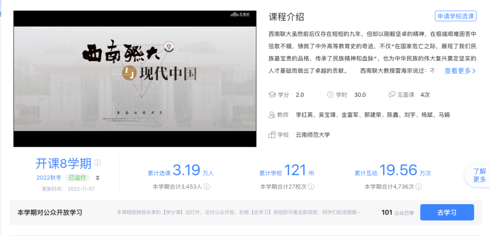 同时,学校面向社会开设“西南联大与现代中国”精品课程,全国110 所高校2万余学生选修,以“宣讲—读物—课程”相叠加的模式探索传承弘扬西南联大精神的主渠道;与新华网共建“课程思政教学研修中心”;以“互联网+思政”模式与云南省委教育工委共同打造面向中小学生的公益在线精品课《西南联大》,服务乡村学校立德树人,不断强化青少年强国有我的使命担当;云南省委组织部在学校设立云南西南联大干部教育学院,充分发挥西南联大旧址现场教学资源,整合全省教育文化资源,深入开展以爱国主义教育、理想信念教育、民族精神教育、教育思想传承、云南党史教育等为主要内容的干部教育培训,自2016年成立以来先后承办培训班350余期,培训各级各类干部5万余人次,学员平均满意度96%以上。
