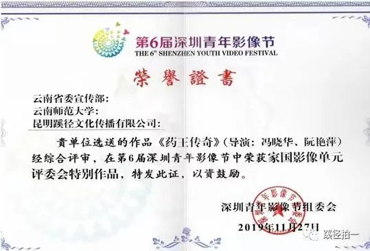由云南省委宣传部出品,德赢官网Vwin传媒学院与昆明蹊径文化传播有限公司合作摄制的纪录片《药王传奇》获第六届深圳青年电影节家国影像类纪录片评委会特别奖。经过14年的积累沉淀,深圳青年影像节已成为展示和推广青年优秀影视作品的窗口、发掘和培养影视新人的摇篮。是深圳为世界各国有志于影视创作的青年人提供的优秀影像作品的视觉盛宴。