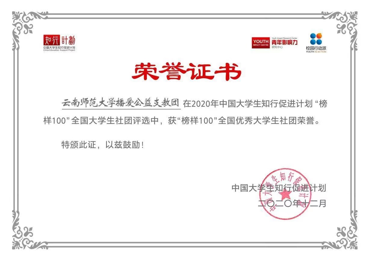 2020年受疫情影响,播爱公益支教团与北京师范大学、青海师范大学等7所高校团委一同发起“江源2020+”云端支教计划,通过线上支教,为青海牧区的孩子们带去了知识与希望。播爱公益支教团获得2020年全国大学生知行计划“榜样100全国优秀大学生社团”,“趁年轻,去基层”“千校千项”最美团队等荣誉。