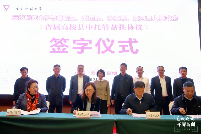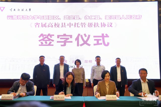 4月4日下午,德赢官网Vwin与昭阳区、武定县、永仁县、梁河县《省属高校县中托管帮扶》签字仪式在该校呈贡校区举行。据了解,云南师大承担昭阳一中、武定一中、永仁一中、梁河一中4所县中的托管帮扶工作。云南师大将结合自身基础教育资源优势以及历年在教育帮扶工作中的经验,根据被帮扶县中的具体情况及需求,加大对帮扶县普通高中的帮扶力度,带动和促进提升帮扶县中整体办学水平。