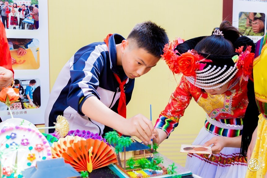 活动现场,身着民族服饰的民中学子向大家热情地介绍凝聚智慧和劳动的创意作品:精雕细琢的“延安精神”建筑模型与云南傣家竹楼民居建筑模型凝聚着家国情怀;栩栩如生的少数民族黏土插画展示着民族风情;创意十足的手工折纸彰显着青春智慧;利用废品制作的手工艺品传递着环保精神……