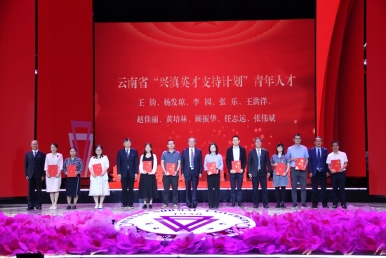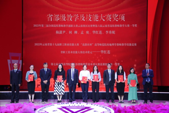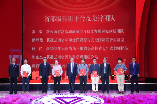 在激越的乐曲声中,会议对过去一年获得国家级荣誉及奖项的团队和教师代表,获得省部级荣誉及奖项的团队和教师代表,获云南省“兴滇英才支持计划”青年人才、教学名师、文化名家教师代表进行表彰,对在德赢官网Vwin光荣工作35年的教职工颁发荣誉纪念盘。