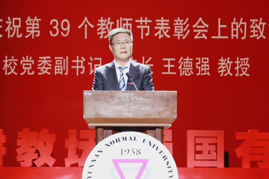 校党委副书记、校长王德强代表学校对长期关心支持学校发展的全体教职员工和离退休老同志表示衷心的感谢,向全体教师致以节日的问候和美好的祝愿,对获得表彰的优秀教师和先进集体致以崇高的敬意。在总结过去一年学校发展成就的同时,王德强表示,学校将继续把教师队伍建设摆在突出位置,支持教师发展、提升教师素质、保障教师所需、增进教师福祉,不断增强老师们的成就感、荣誉感、幸福感。他希望广大教师不忘立德树人初心,牢记为党育人、为国育才使命,团结拼搏、爱校敬业,潜心治学、开拓创新,争做“四有”好老师和“四个引路人”,以更加昂扬的奋斗姿态、更加坚定的决心毅力、更加强烈的使命担当,努力培养德智体美劳全面发展的社会主义建设者和接班人,为加快建设教育强国、实现第二个百年目标、实现中华民族伟大复兴的中国梦作出更大贡献。