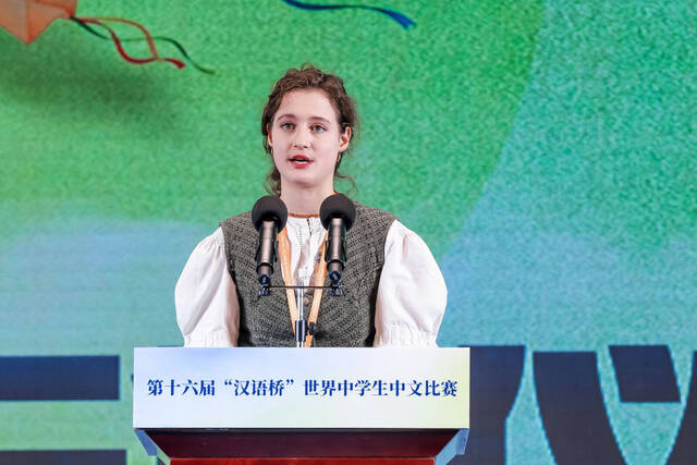德国选手冉诗怡代表本届选手致辞。她说到,“汉语桥”让全世界的青少年带着同一个梦想远道而来,她将和各国选手一起用中文表达心声、用真诚增进友谊,在文化交流中共同成长。