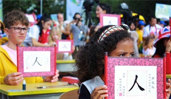 开营仪式上,58名小朋友参加了富有中华传统文化特色的开笔礼。他们身穿各自国家的传统服饰,跟着示范者整理衣冠,行见面礼;一撇一捺,用毛笔在描红纸上写下顶天立地的“人”字。之后,他们的额头被点上朱砂,意味开蒙启智,希望他们奋发学习,坚持不懈追逐中文梦想。