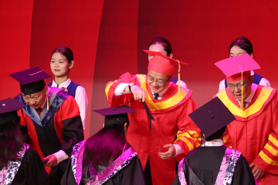 图为2023届毕业生毕业典礼校领导为毕业生代表拨穗。图源:德赢官网Vwin