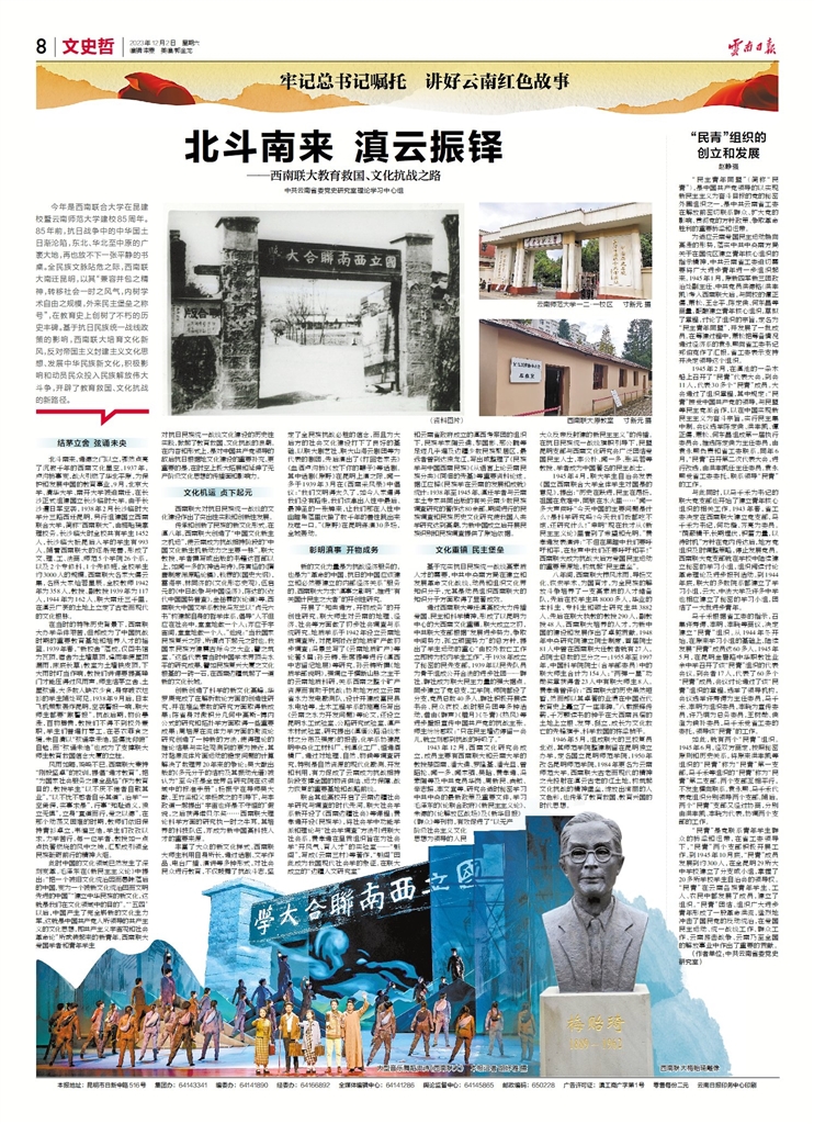 通过西南联大等迁滇高校大力传播爱国、民主和科学精神,形成了以昆明为中心的大西南文化重镇。联大成立之初,中共联大支部根据“发展进步势力,争取中间势力,孤立顽固势力”的总方针,提出了学生运动的重心“由校外救亡工作立即转为校内学生工作”,于1938年成立了秘密的民先支部,1939年以民先队员为骨干组成公开合法的进步社团——群社。群社成为联大民主力量的强大据点。同步建立了党总支,工学院、师院都设了分支,党员总数40多人。群社积极开展读书会、民众夜校、战时服务团等多种活动,借由《群声》《腊月》《冬青》《热风》等进步壁报宣传中国共产党的抗战主张。师生纷纷感叹:“只在民主墙边停留一会儿,就立刻感到抗战的呼吸了。”