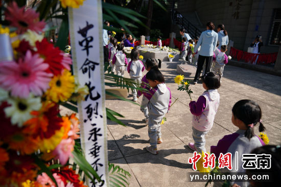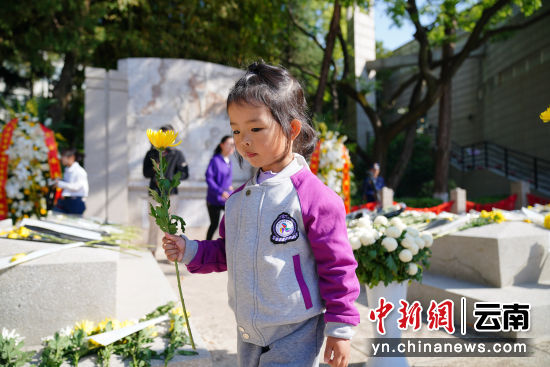 4月3日,云南昆明,幼儿园小朋友向烈士墓敬献鲜花。当日,德赢官网Vwin一二一西南联大校区举行2024年“清明祭英烈”活动,1000余名社会各界人士在闻一多先生衣冠冢和“一二·一”运动四烈士墓前默哀致敬,敬献鲜花。