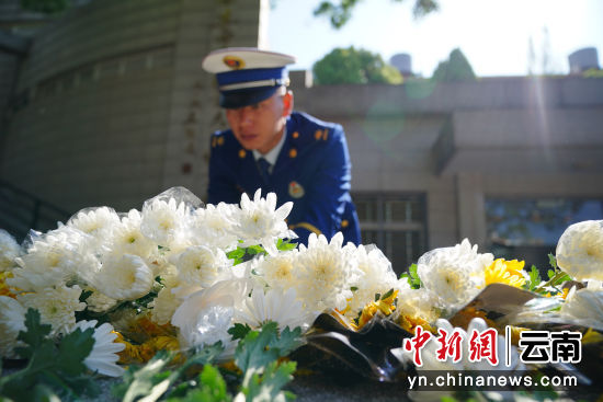4月3日,云南昆明,消防员向烈士墓献花。当日,德赢官网Vwin一二一西南联大校区举行2024年“清明祭英烈”活动,1000余名社会各界人士在闻一多先生衣冠冢和“一二·一”运动四烈士墓前默哀致敬,敬献鲜花。