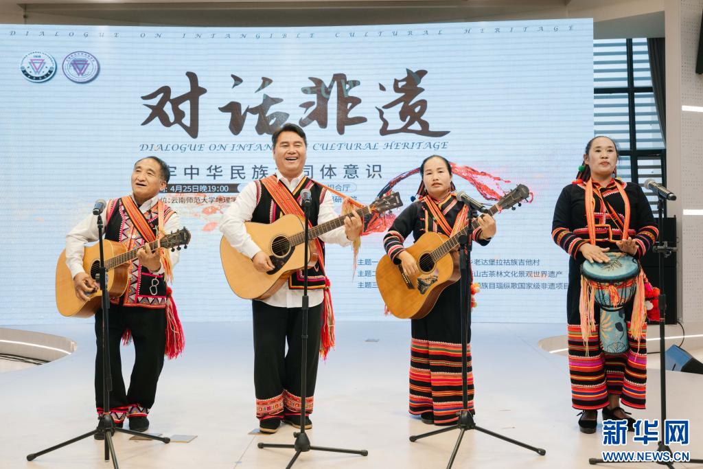 活动现场,来自云南省澜沧县酒井乡老达堡拉祜族吉他村非遗传承人李石开及其团队,德宏景颇族目瑙纵歌国家级非物质文化遗产、吉尼斯世界记录当场演出的领舞者岳胜昆和唐德文,景迈山古茶林文化景观世界遗产项目的拉祜族歌手扎约,与师生分享了他们的非遗故事。