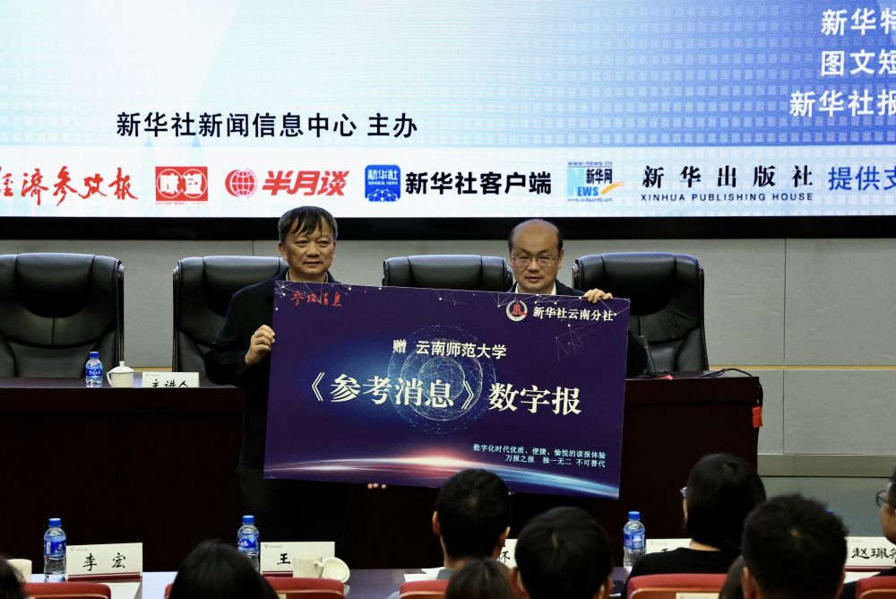 新华社云南分社分党组成员、副社长王江代表新华社向学校师生赠阅《参考消息》数字报(2024年9月26日摄)。