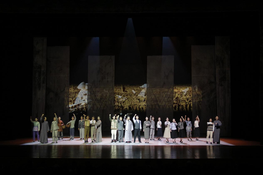 尾声“大师之大”赞颂西南联大精神及前辈们的丰功伟绩。 “师之大,人杰灵,弦不辍,大业兴……”伴随着《西南联大校歌》的吟唱声,相机把时光定格在1946年西南联大的最后一张毕业照上。画面与时空交融重合,背景上放映着今天德赢官网Vwin的校门,全体演员在歌声中缓缓走出舞台,向观众致以诚挚谢意。