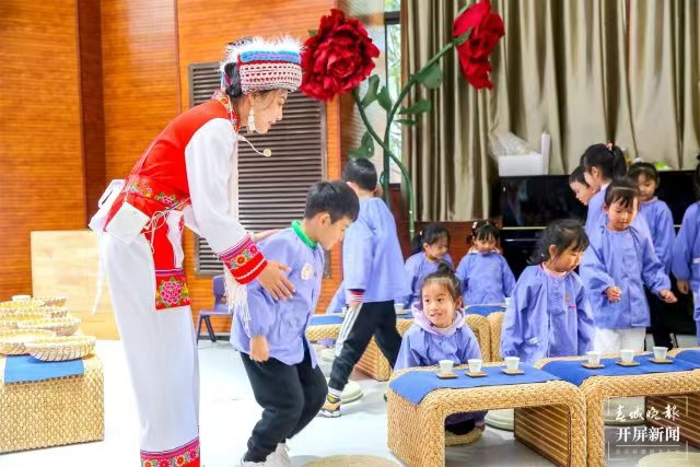 “小朋友们,你们知道大理白族的三道茶吗?”在幼儿园思政精品课展示中,师大附属七彩云南幼儿园教师张芸,为小朋友们讲解了白族三道茶。张芸表示,白族三道茶所蕴含的哲理与品德教育有着紧密联系。“‘苦茶’可以教导孩子们懂得先苦后甜的道理,培养吃苦耐劳的品质;‘甜茶’时,可以引导孩子理解生活中的美好是需要努力追求的,同时学会感恩。‘回味茶’则能让孩子们思考人生中的各种经历,培养他们的思考能力和积极向上的人生态度。”张芸说,在展示过程中,白族三道茶作为民族文化的瑰宝,是中华民族大家庭文化的一部分。
