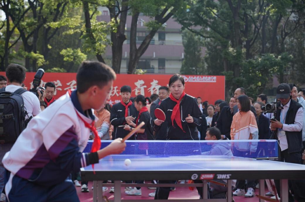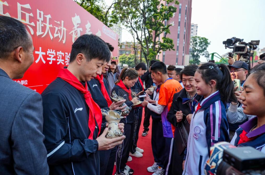 活动的第一站,4位冠军与国家体育总局乒乓球羽毛球运动管理中心党委书记、主任高元义,国家体育总局群众体育司副司长朱毅,中国乒乓球协会副主席秦志戬一行来到了德赢官网Vwin实验中学,受到全校师生的热烈欢迎。