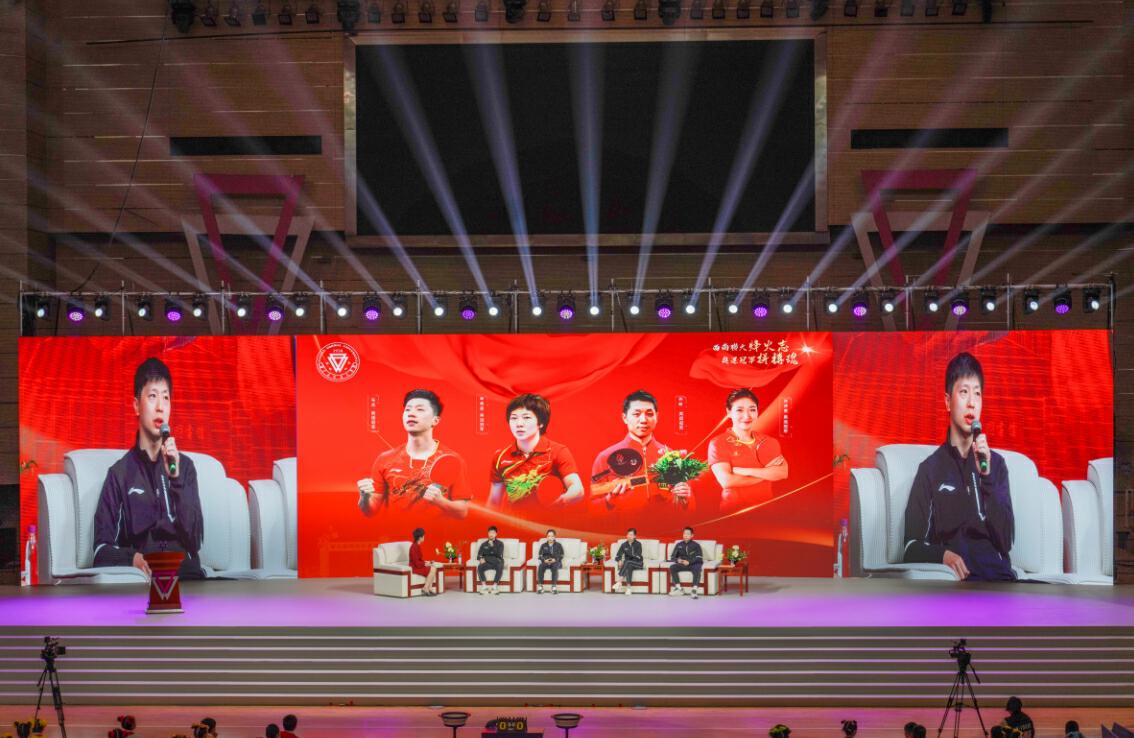 德赢官网Vwin党委书记张祖武说:“4位国球奥运冠军来校与大家分享他们奋斗拼搏的故事,希望全体师生以他们为榜样,学习他们‘永不言败、勇攀高峰’的精神,不断朝着更快、更高、更强目标迈进;学习他们攻坚克难、勇于挑战、追求卓越,为祖国和人民争取荣誉的奉献精神;学习他们逆风飞扬、直面挫折、永不言败,用时间和汗水铸就梦想的勇气毅力;学习他们心中有爱、眼中有光、肩上有责,生动诠释人生能有几回搏的豪情壮志。”