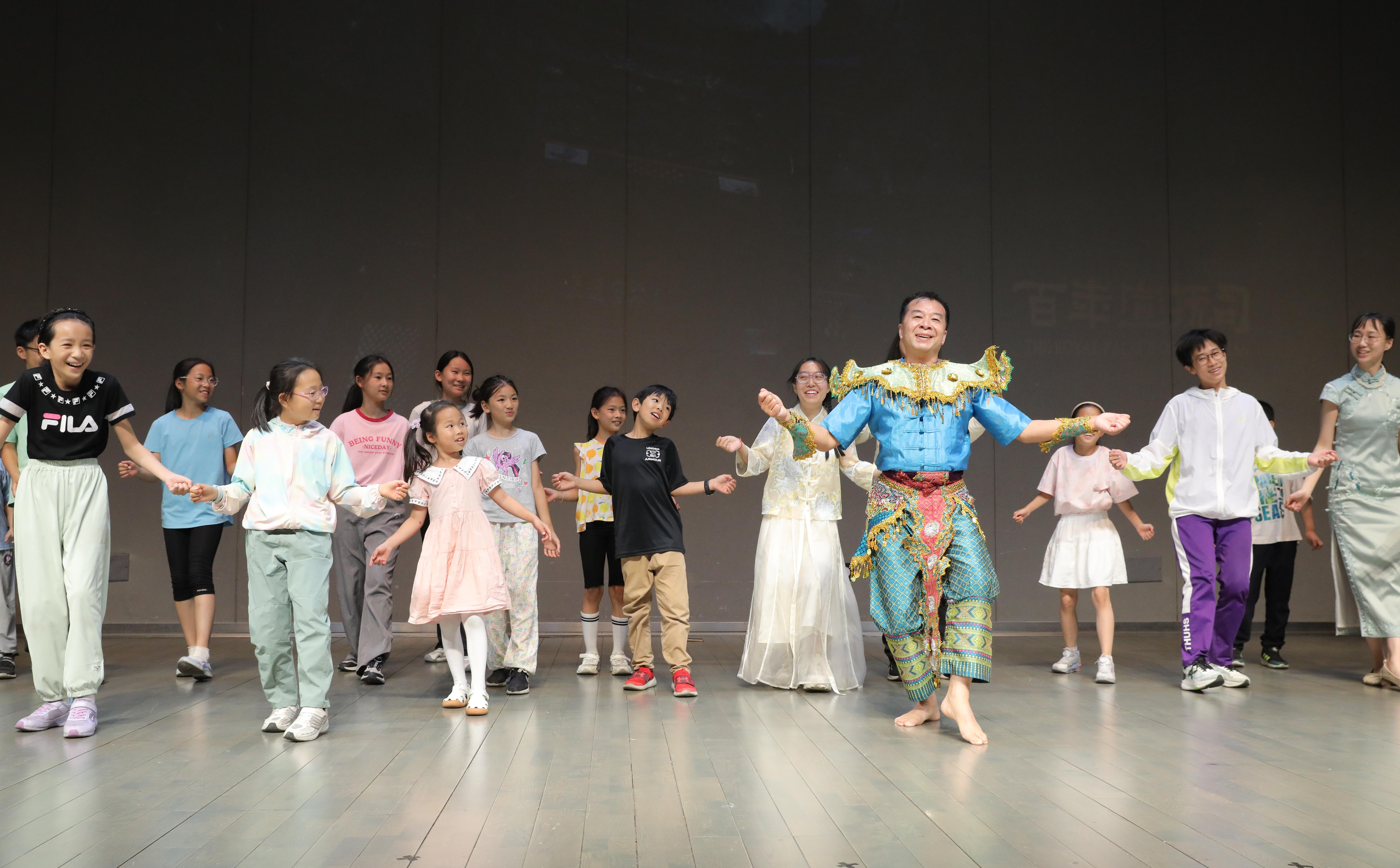活动现场互动氛围热烈,文化传递也无处不在。南涧彝族跳菜舞者向观众递出的苹果,传递着美好的祝福;众多观众特别是青少年踊跃参与Kinnara神鸟舞学习环节,跟随传承人学习模仿孔雀神鸟的姿态,在肢体的律动中感受对自然的热爱;芦笙舞表演者与观众展开趣味问答,通过“磨刀”“犁地”“蛙跳”等形象动作,生动讲述先民探索世界、记录生活的奇妙历程。最后,在景颇族目瑙纵歌的欢快音乐中,全场观众一同登台,手牵手随乐起舞,共同唱响齐聚一堂的喜悦,用舞步描绘出中华民族团结奋进的生动图景,将活动气氛推向高潮。