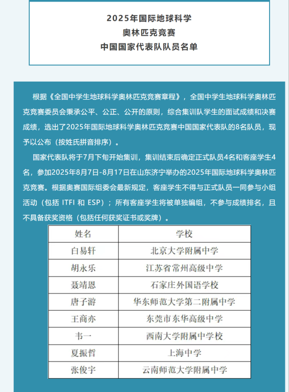 6月15日,这3位同学参加了2025年国际地球科学奥林匹克竞赛中国国家代表队的线上面试选拔。最终,张俊宇同学凭借优异成绩成功入选中国国家代表队。