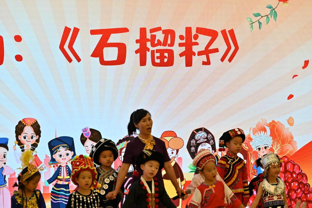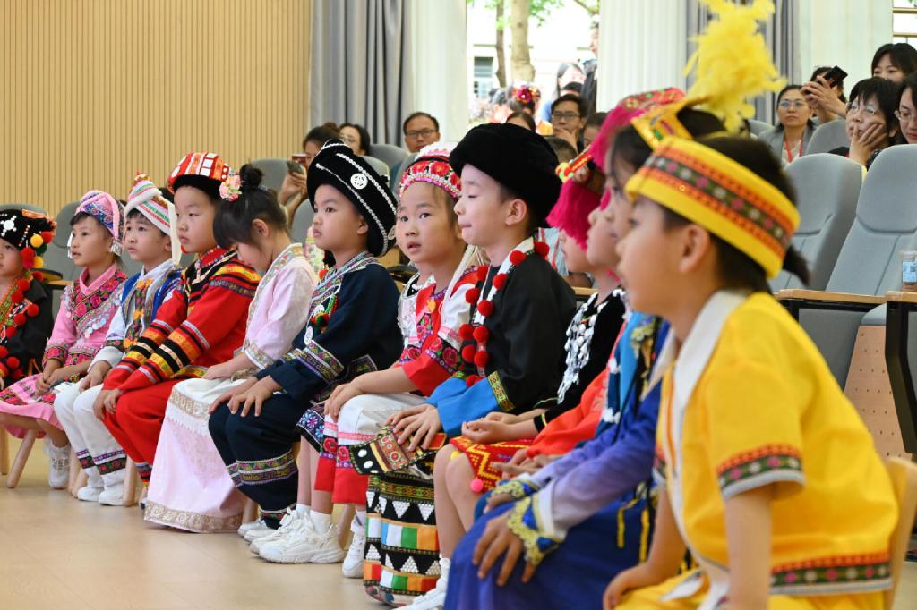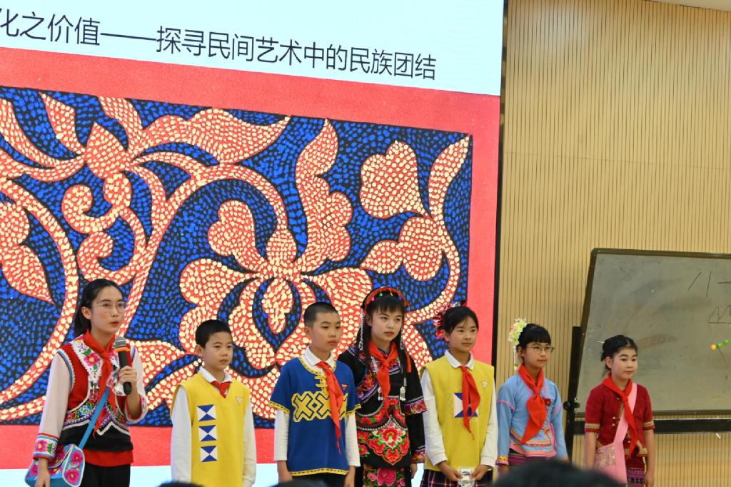 云南师大附属小学刘婷婷老师以体验性教育为主的彝族文化思政课成为亮点,课堂以彝族《朵洛荷》民歌启幕,同学们手执绣片,分组探究彝族刺绣中蕴含的民族融合智慧:马缨花纹样象征吉祥如意,校服设计展现多民族文化交融。师生齐唱彝语版《我和我的祖国》,用最真挚的歌声表达对中华民族共同体的认同。