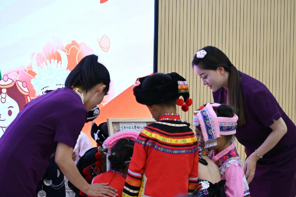云南师大幼儿园徐嘉蔚老师针对幼儿园阶段以启蒙性教育为主,带来了一堂思政实践展示课。课程在孩子们清脆的《石榴籽》歌声中开启,徐老师通过讲述独龙族的民族渊源与发展变迁,引导小朋友们理解“民族团结一家亲”的深刻含义。在动手环节中,孩子们共同完成了一幅象征团结友爱的“石榴籽”画作,并将这份作品赠予现场观摩教师。