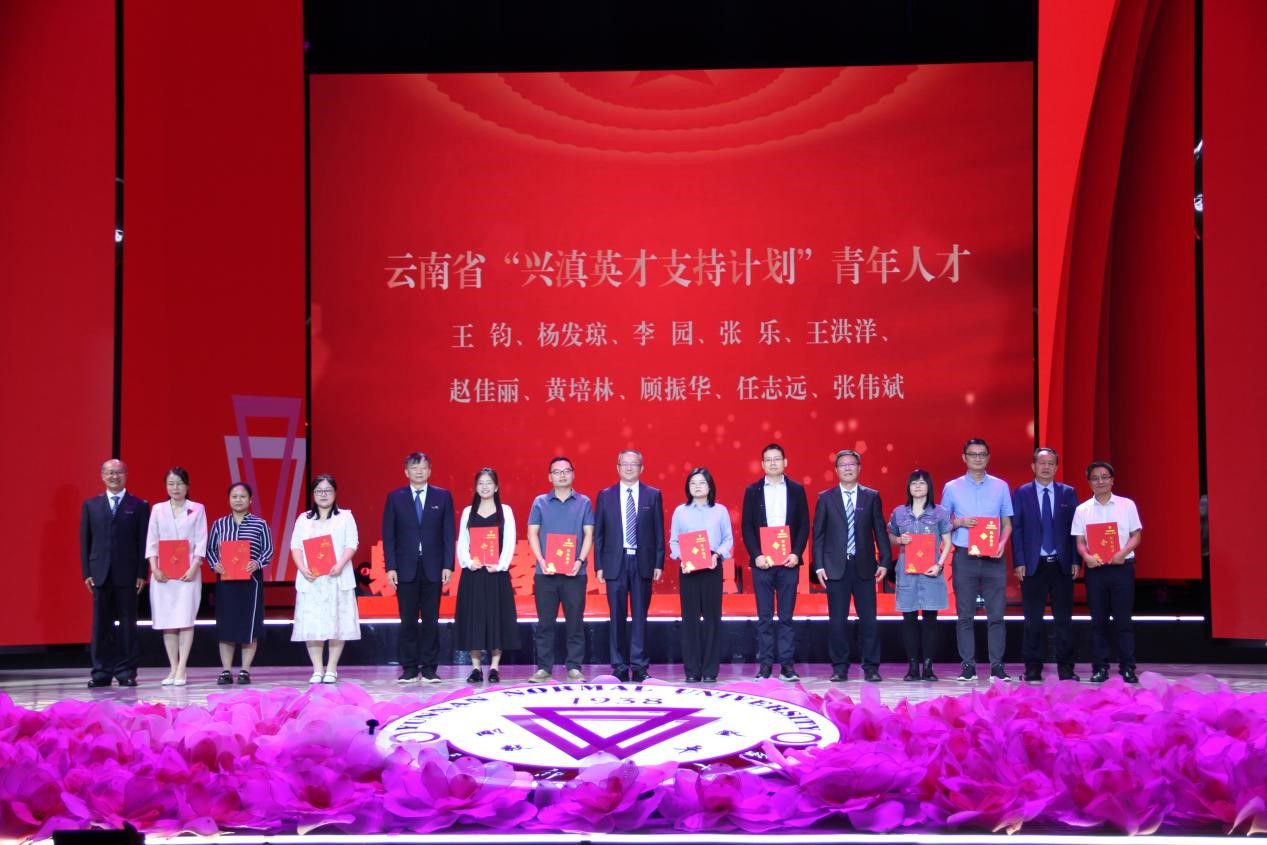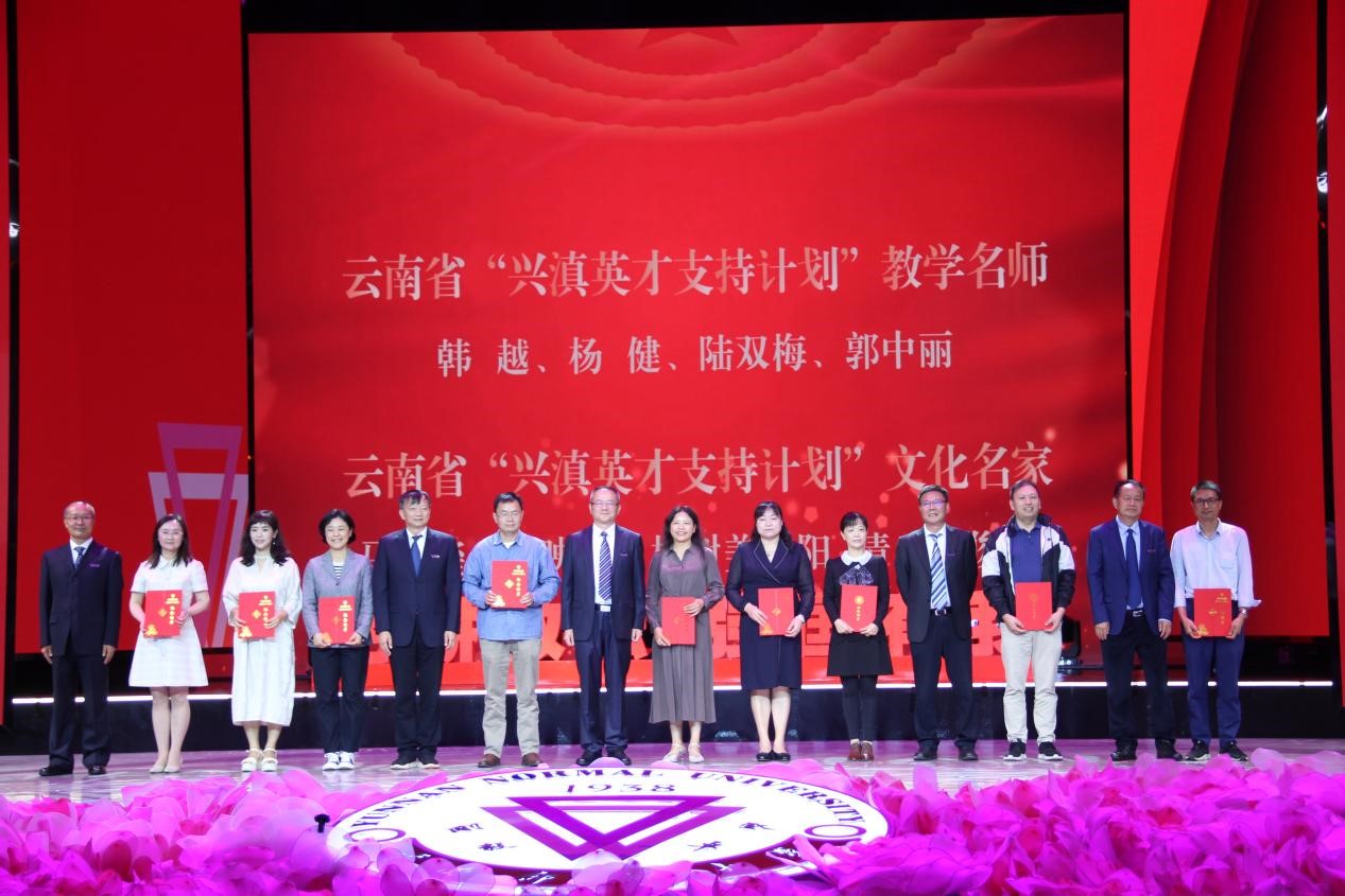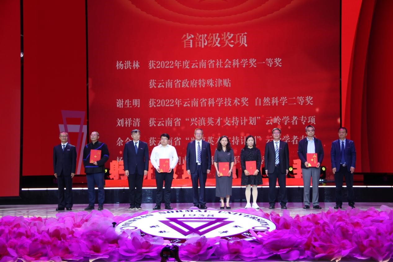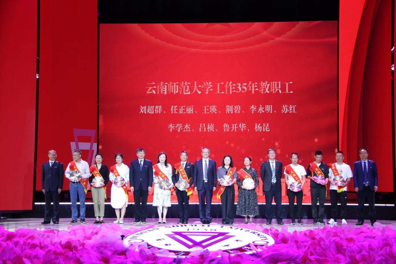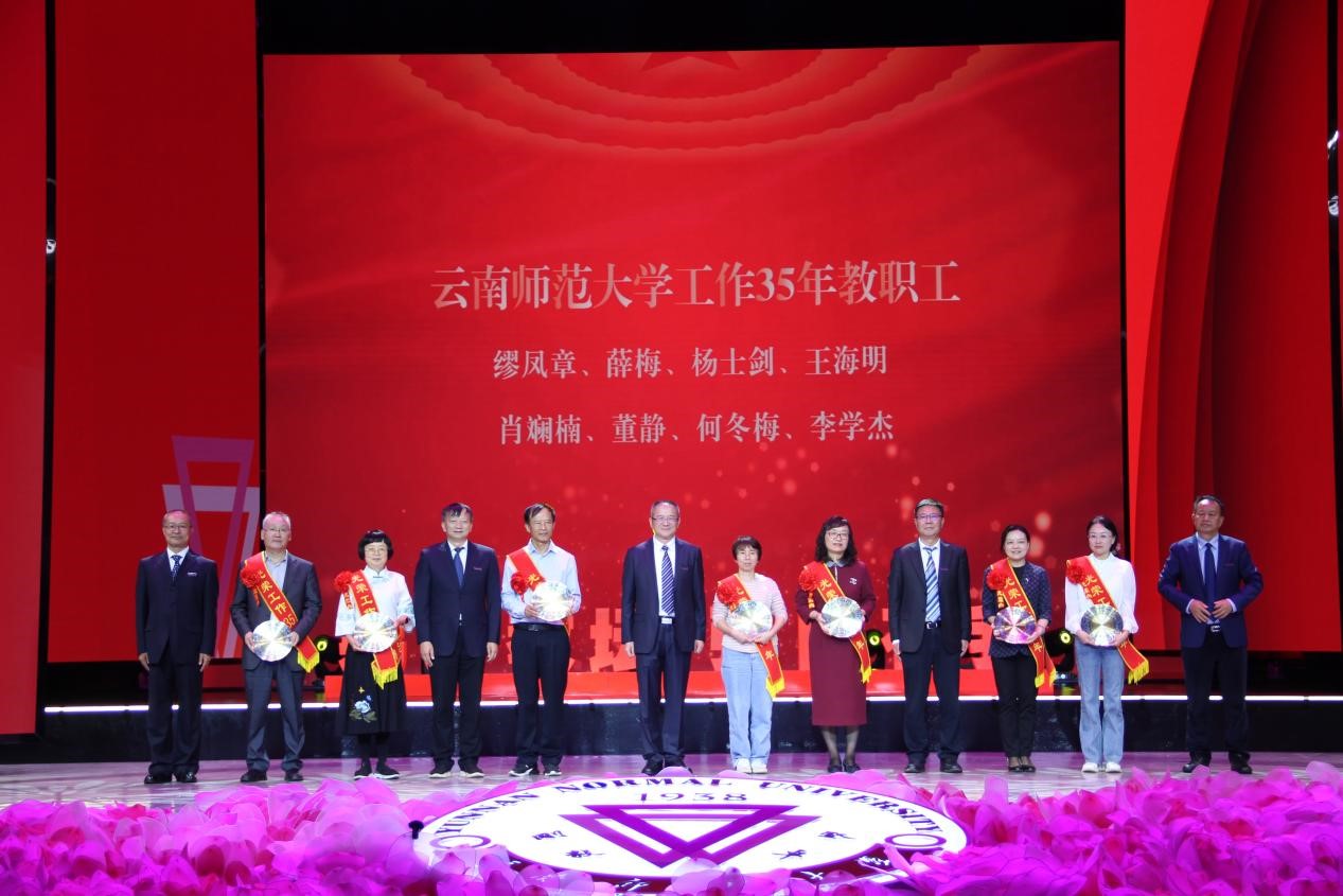在激越的乐曲声中,会议对过去一年获得国家级荣誉及奖项的团队和教师代表,获得省部级荣誉及奖项的团队和教师代表,获云南省“兴滇英才支持计划”青年人才、教学名师、文化名家教师代表进行表彰,对在德赢官网Vwin光荣工作35年的教职工颁发荣誉纪念盘。